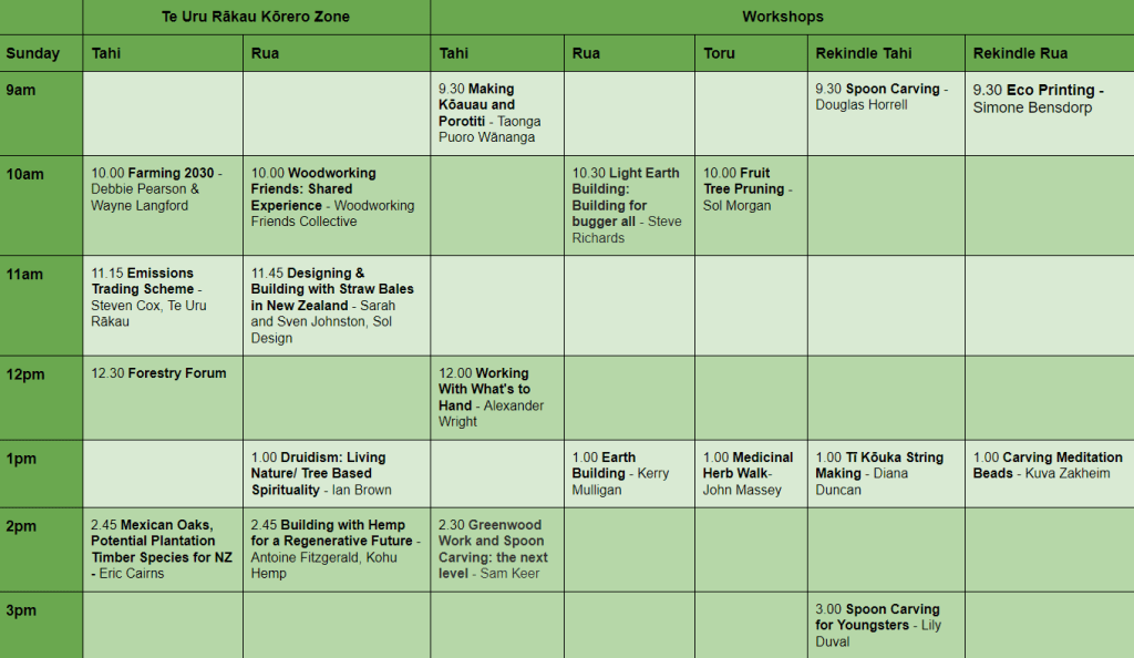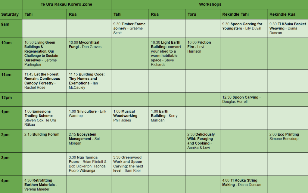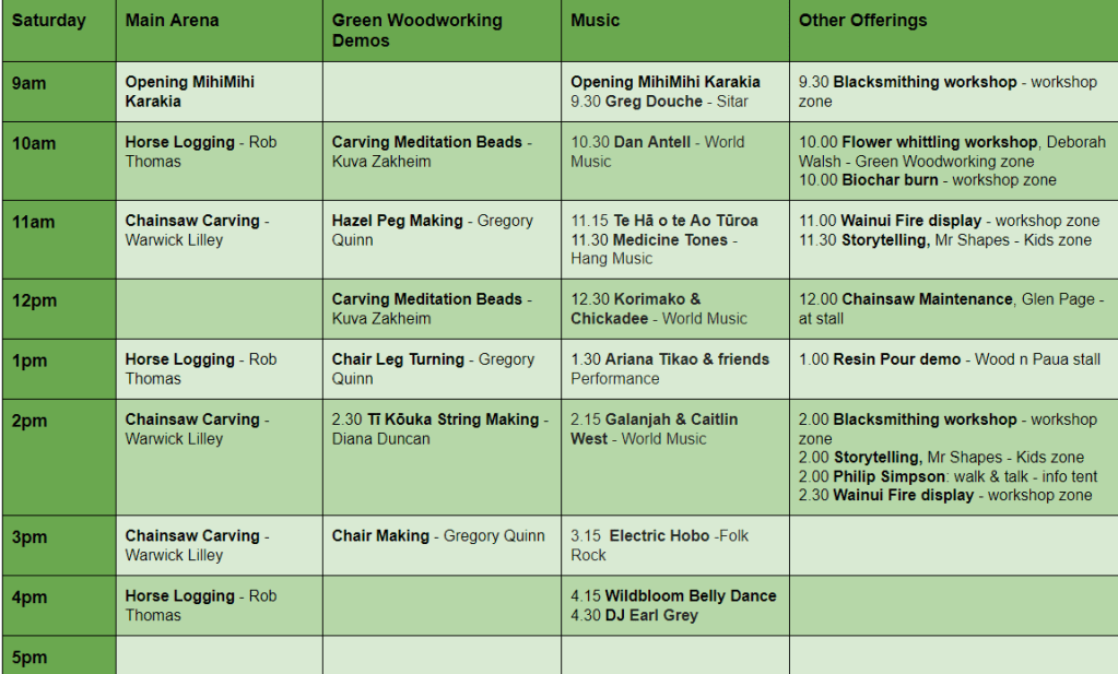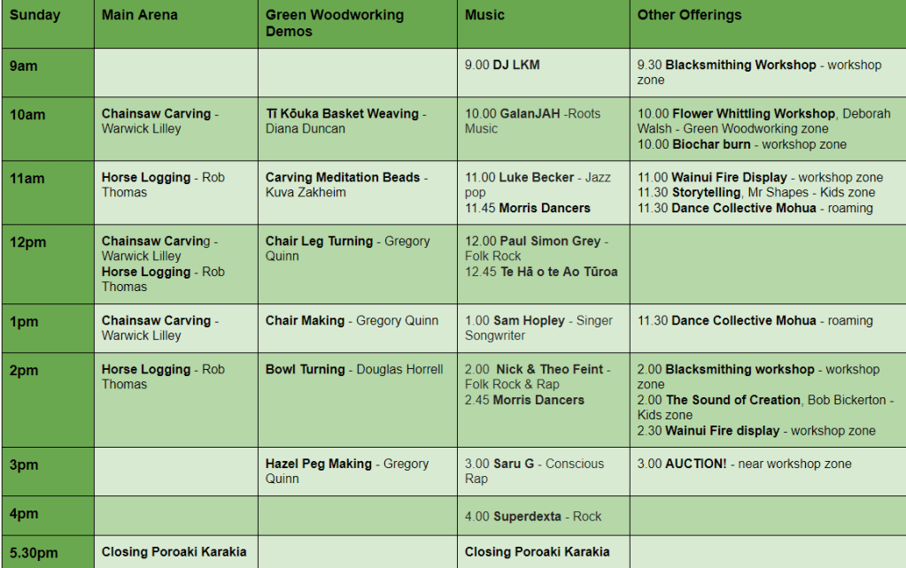 The children’s activities in the Kids Zone go all day: we have Bushcraft with Renford; and Woodworking with Brian and Karen from Weka Workshop, there will also be kids tree climbing in the mornings with harness and ropes guided by a champion tree climber!